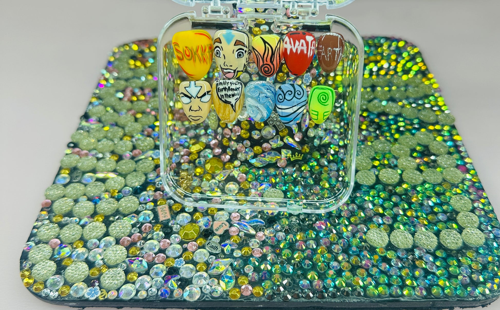 Hand-painted, premium art press-on nail set inspired by the four elements. This 10-piece acrylic set features detailed character and element artwork, including water, earth, fire, and air motifs. Each nail is individually painted and sealed for a smooth, glossy finish with long-lasting wear.
