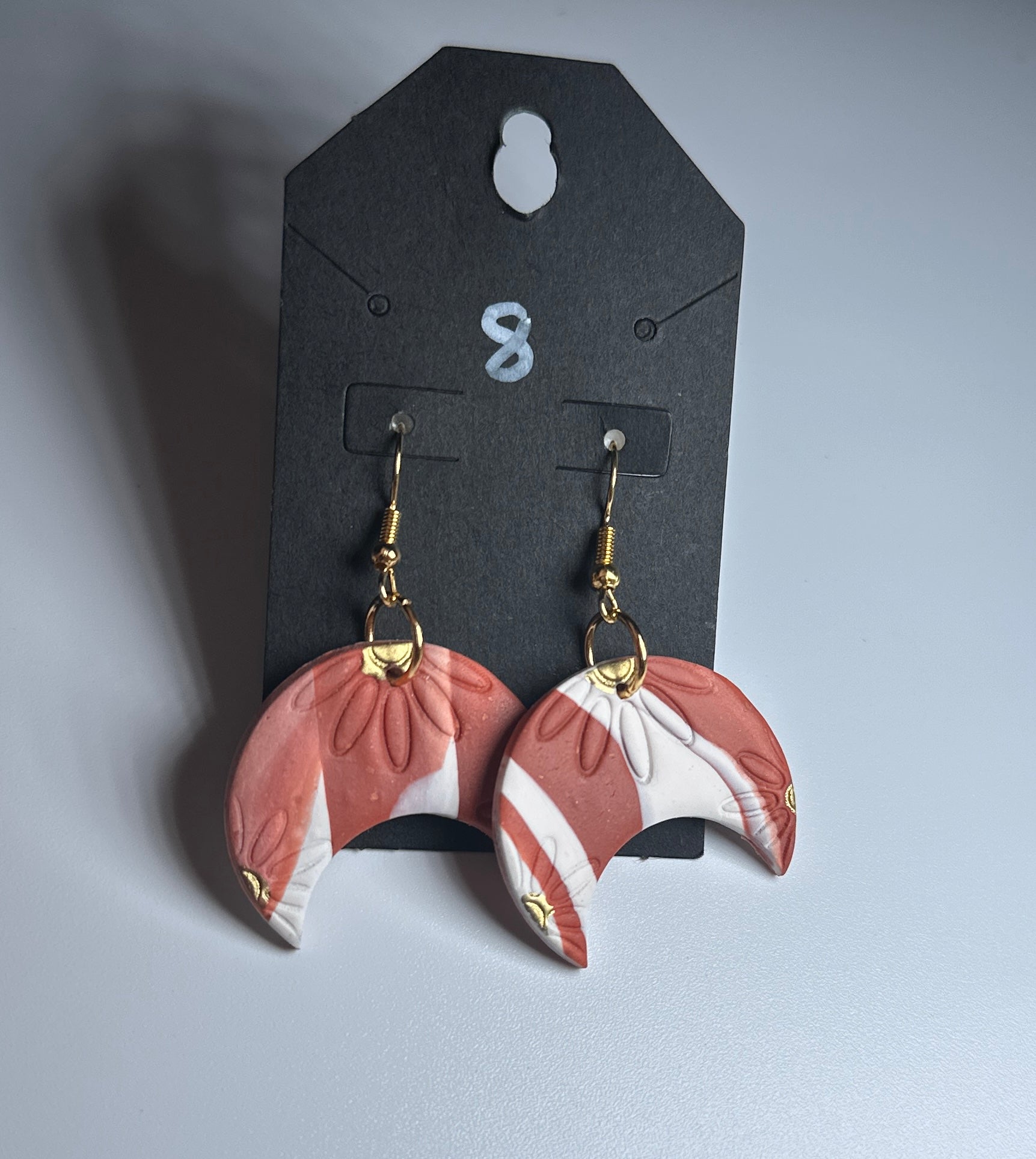 Soft, celestial, and blooming with charm the “Blush Bloom Moon” earrings by LBN Clay Creations are the perfect blend of floral and moon magic. These handcrafted crescent moons feature warm blush and white marbling with pressed daisy details and subtle gold foil accents. Lightweight and dreamy, they’re perfect for boho babes, moon lovers, and flower girls at heart.