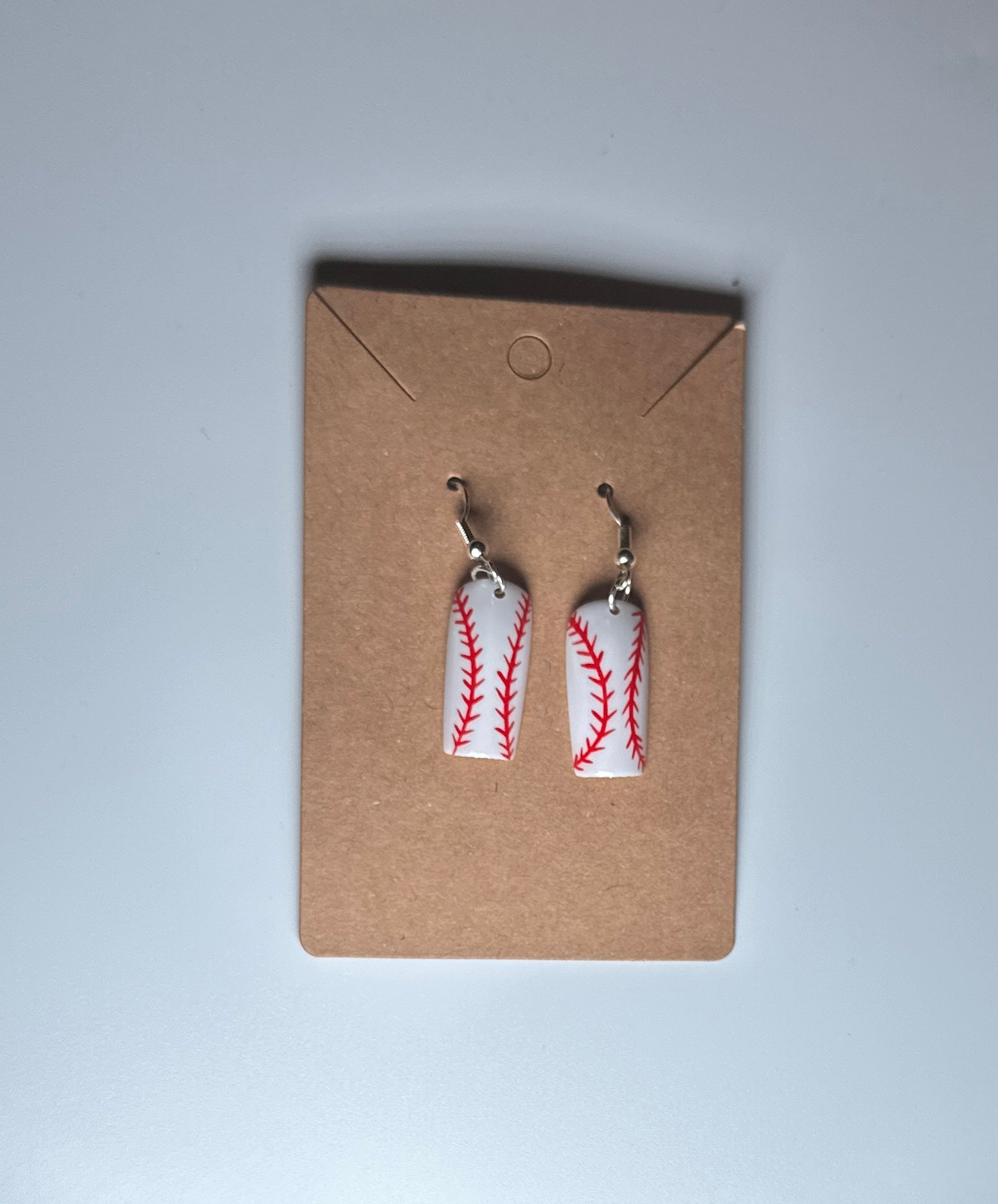 Sporty meets cute with these handmade press-on nail earrings styled like mini baseballs. Perfect for game day, team moms, or anyone who wants to hit a home run with their accessories.