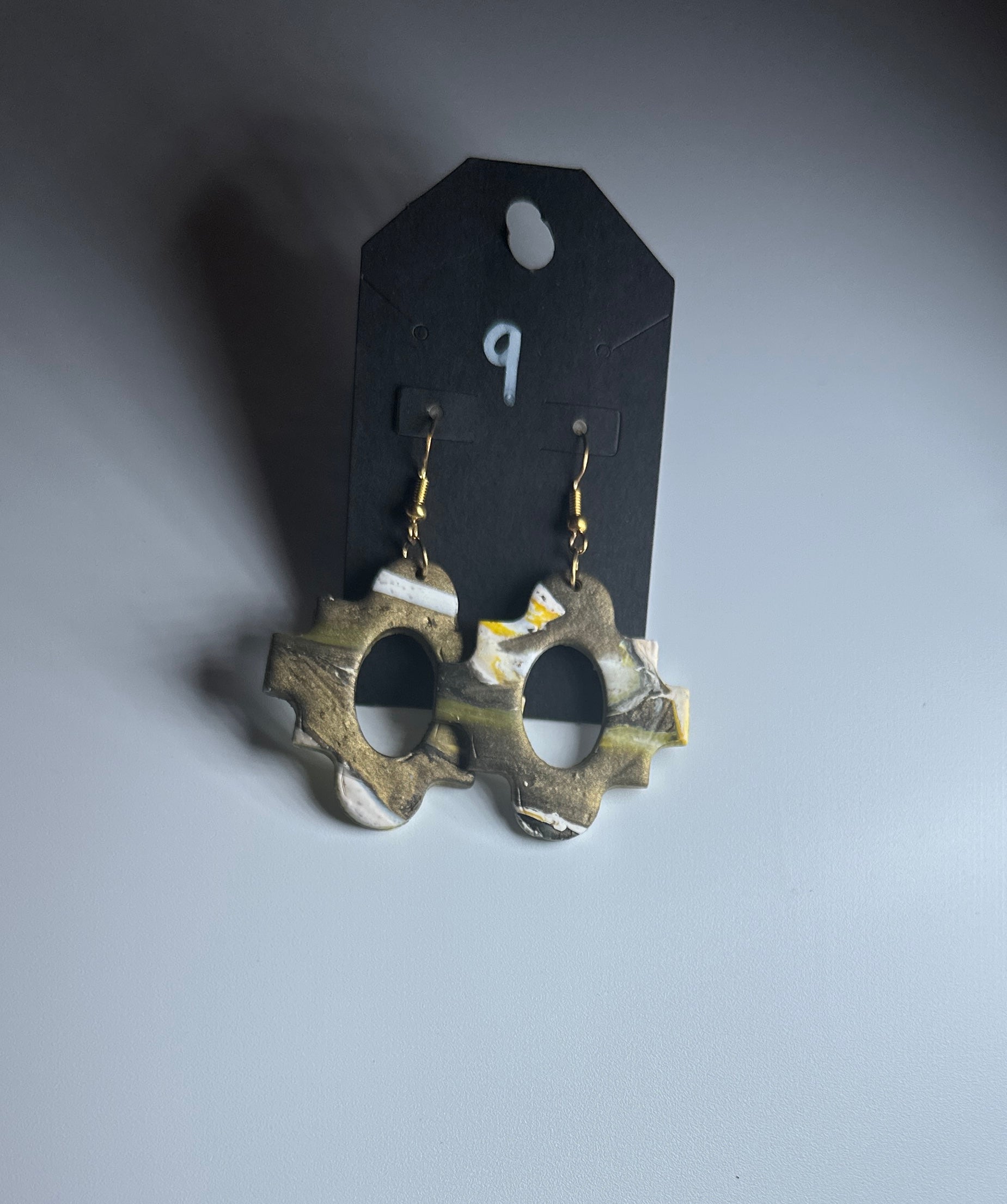 These bold polymer clay earrings combine art and edge. With a sculptural geometric cutout shape and a mesmerizing marbled mix of green, gold, white, and a splash of yellow, these dangles are made to stand out while still keeping things grounded and earthy.