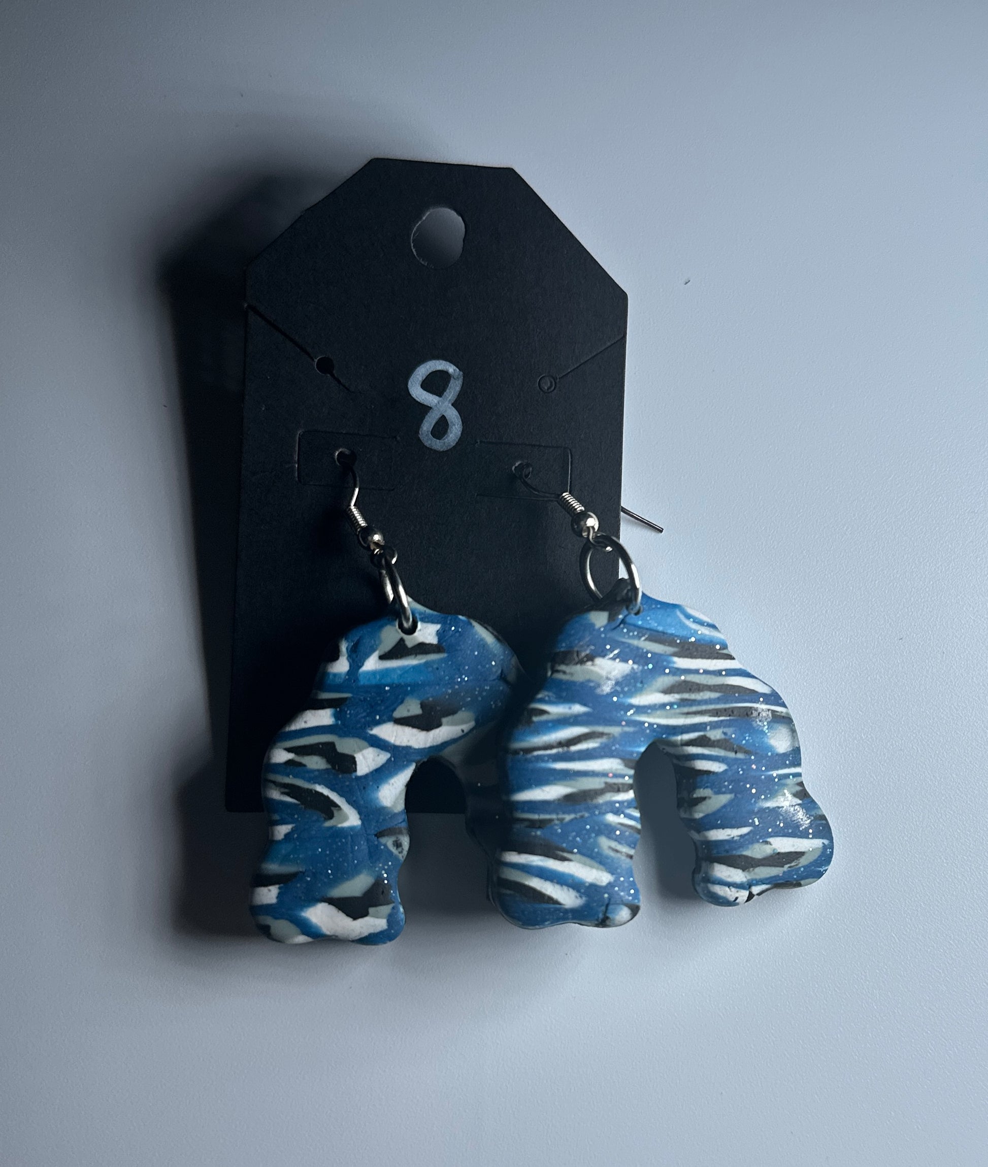 Make waves with these Midnight Waves earrings handcrafted polymer clay arches in bold oceanic blues, whites, and blacks. The unique pattern swirls like a midnight tide, adding a splash of fierce energy to any outfit.