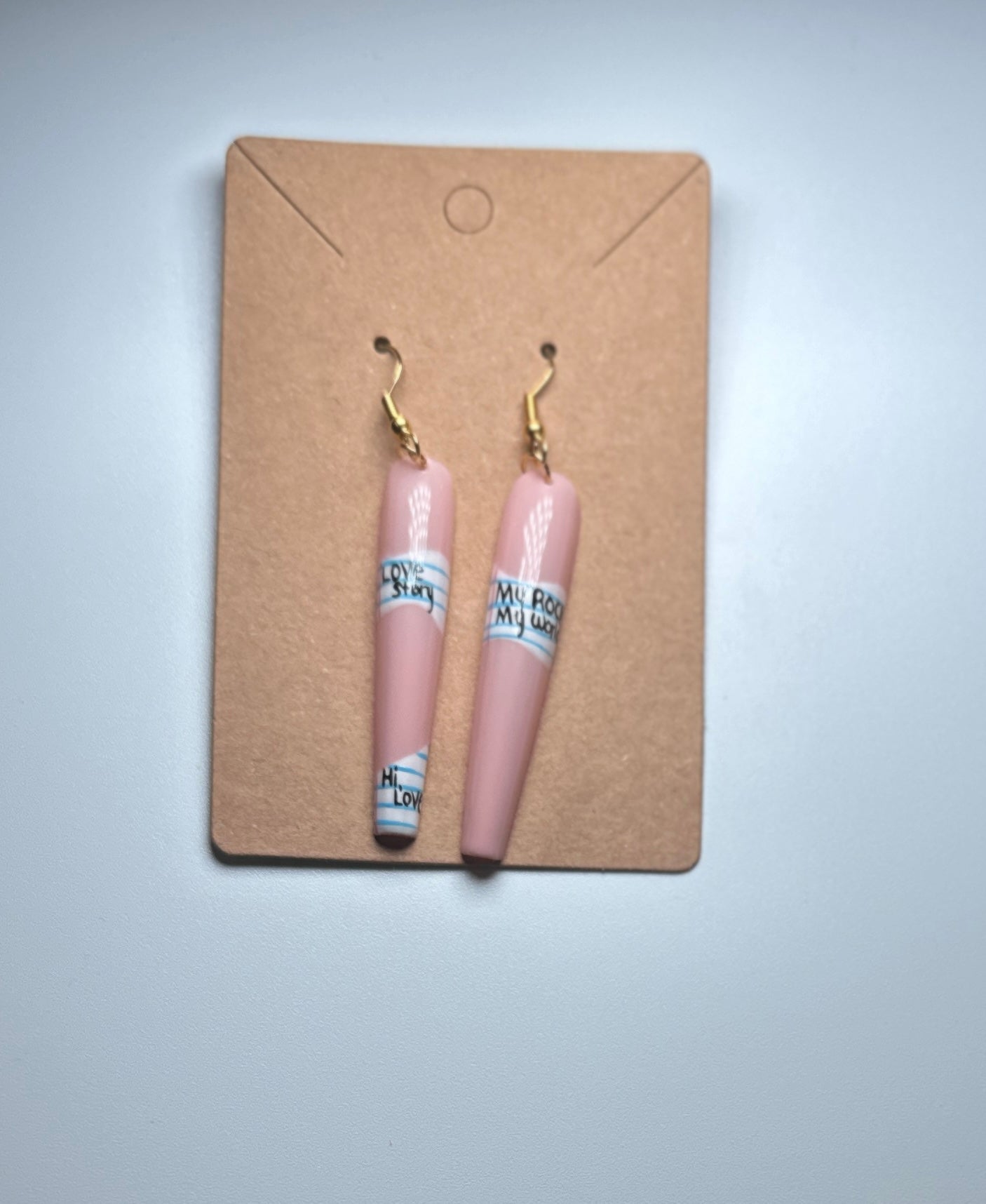 Tell your story without saying a word. These handmade earrings feature real press-on nails transformed into wearable art. Soft pink nails are adorned with notebook-style text that reads “Love Story” and “My Rules, My Way” a bold statement of confidence and individuality.