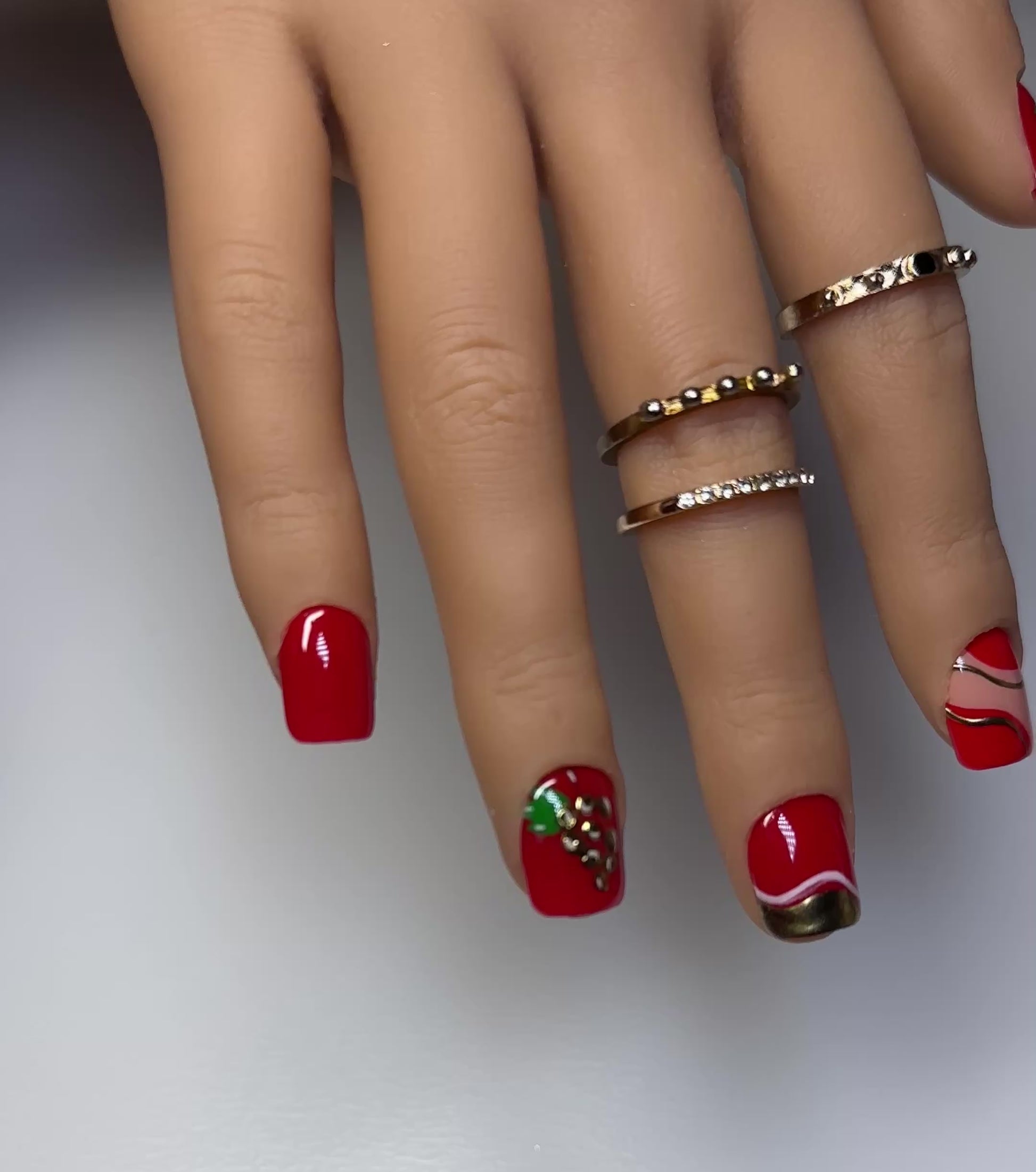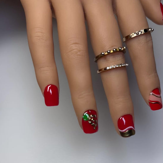 Get into this juicy red vibe with a playful twist! This bold, eye-catching set features vibrant red polish, gold accents, and a strawberry-inspired 3D detail thatโ€™s so summer. Finished with abstract swirls and a luxe, glossy top coatโ€”this design is perfect for fruity fashionistas and glam girls who want their nails to pop.