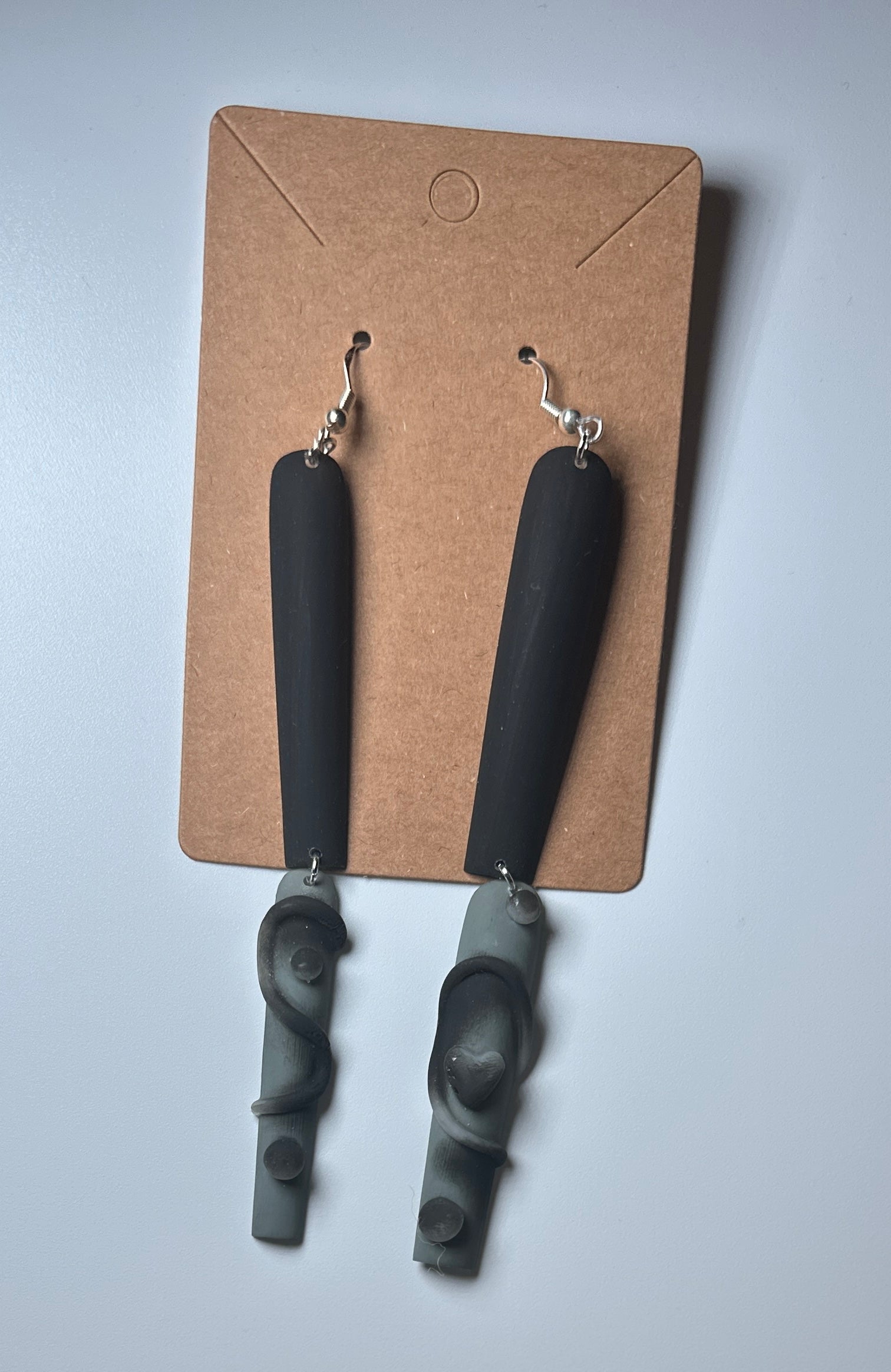 Bold, moody, and dimensional — the “Depth & Detail” earrings bring art to life. These matte black and gray drop earrings feature raised abstract patterns, including a sculpted heart, swirls, and dot accents. A wearable sculpture for lovers of texture and edge.