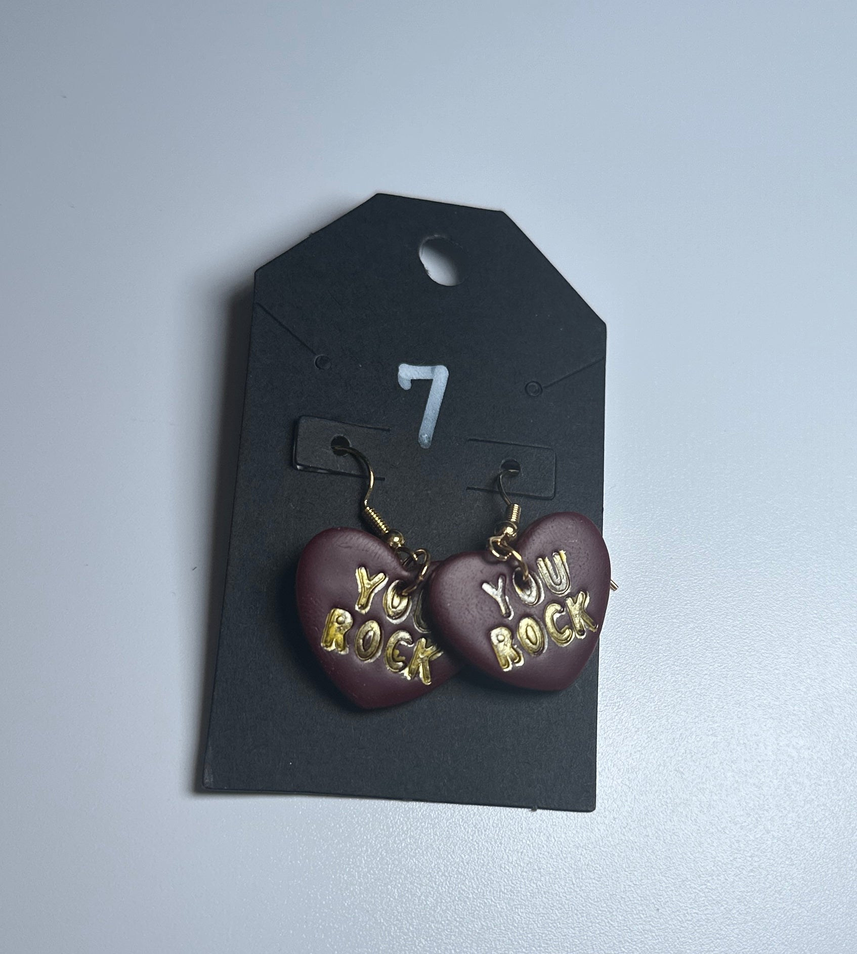 Show love and give compliments with every outfit the “You Rock” heart earrings by LBN Clay Creations are a wearable confidence boost. These handmade clay hearts feature a deep wine-red base with bold, gold lettering that shouts encouragement. Lightweight and sweet with a message that matters, these earrings make the perfect gift or mood-lifting accessory for yourself.